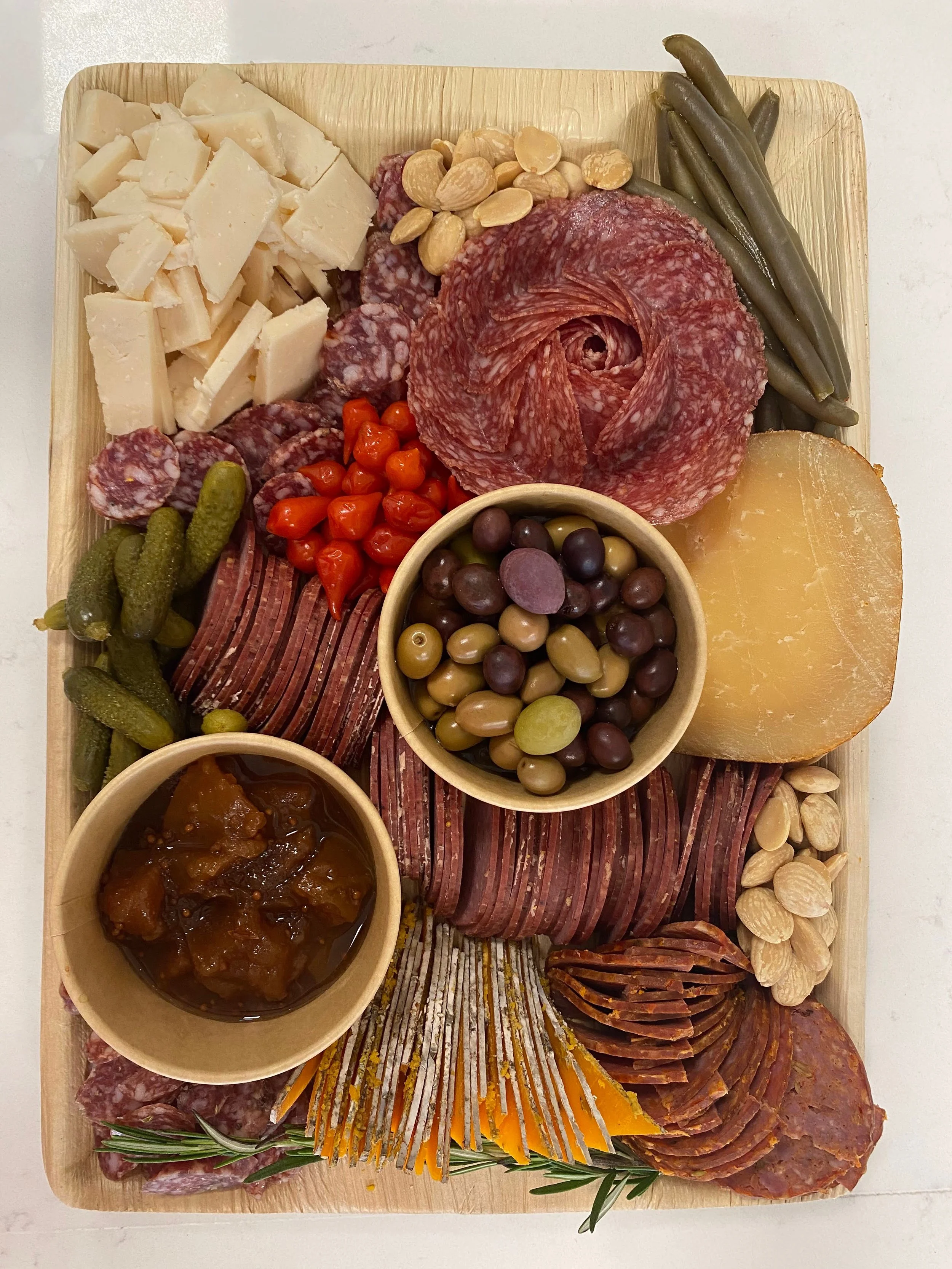 includes meats, cheeses, jam, pickles (crackers/crostini not included unless requested)